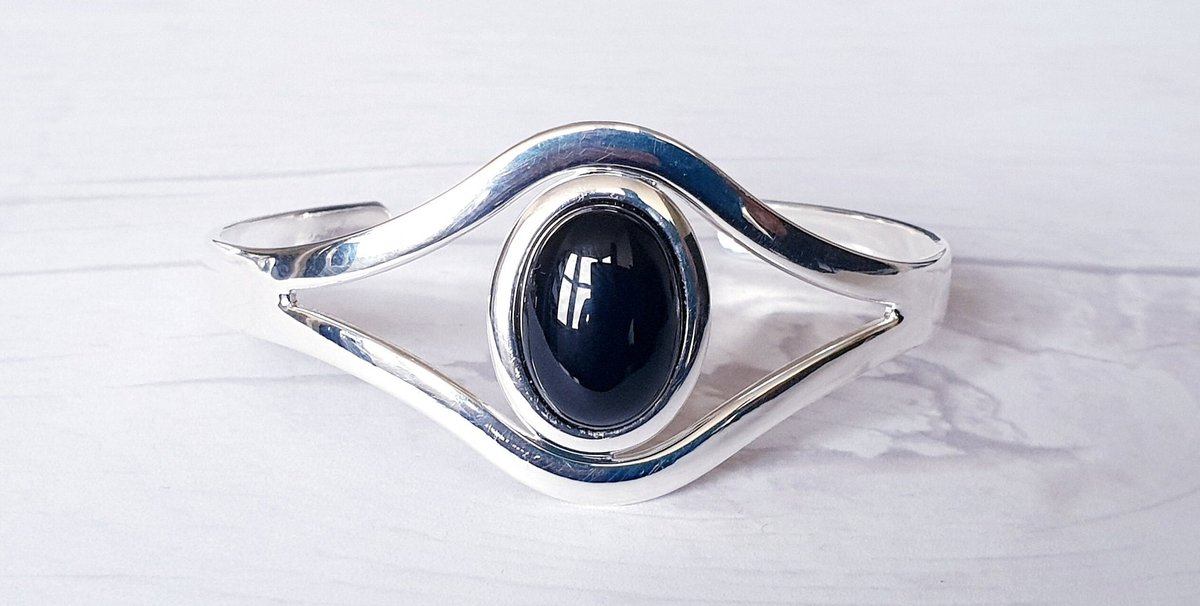 This black onyx cuff bracelet showcases a stunning 18x13mm oval cabochon in deep, glossy black. The natural gemstone is securely mounted on a silver-plated adjustable cuff that opens for easy wear and fits most wrists comfortably.