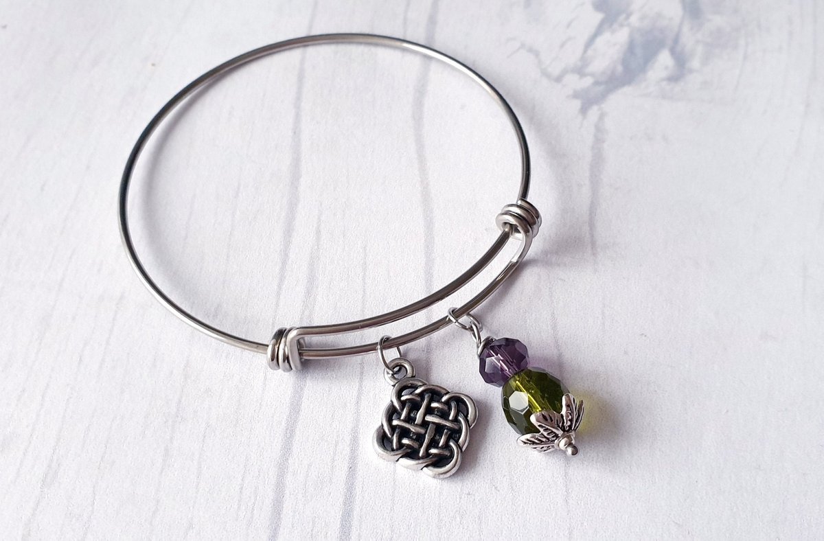 Stainless Steel Thistle Bangle Bracelet, Celtic Knot Charm, Scottish Jewelry, Adjustable