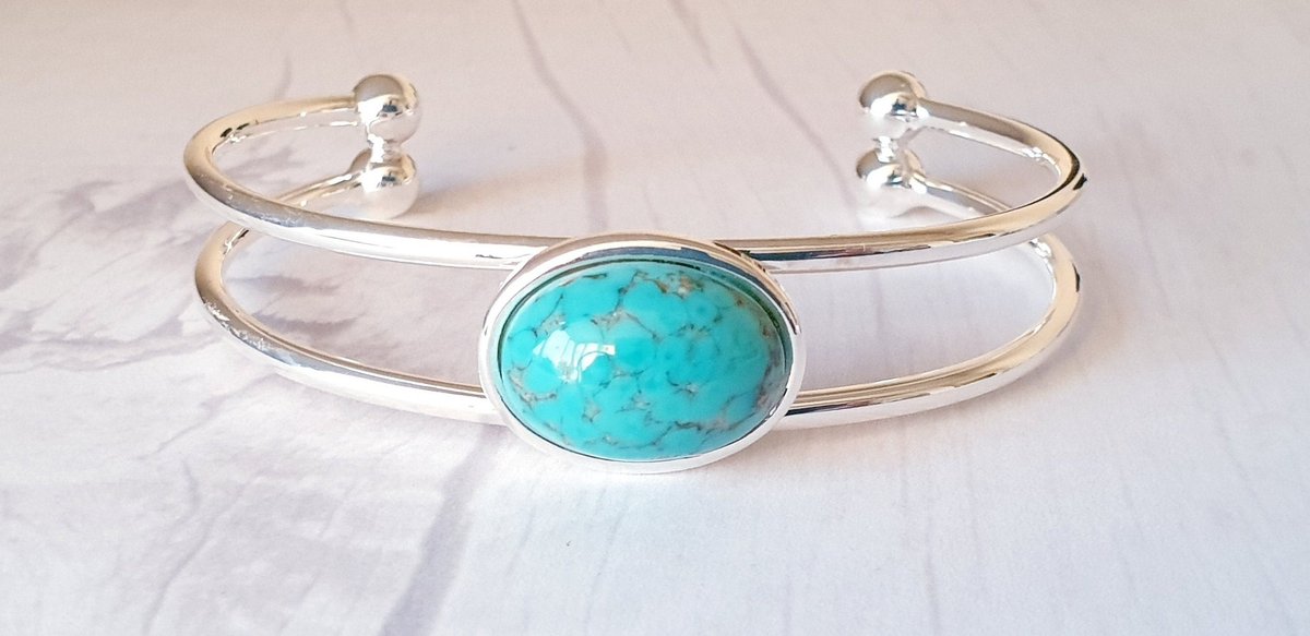 This bangle features a high-quality faux turquoise vintage glass cabochon that captures the beautiful blue-green tones of natural turquoise.