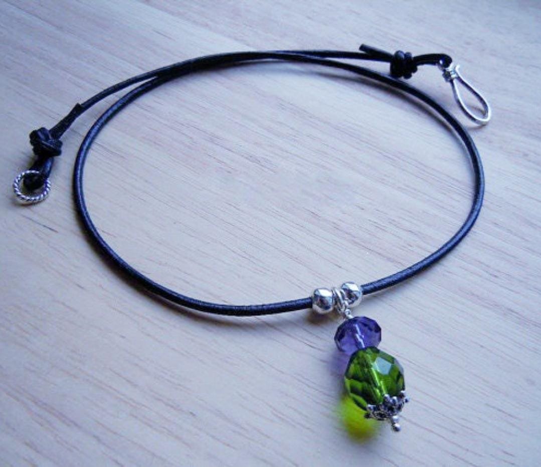Black Leather Choker Necklace, Thistle Pendant, Scottish Jewelry, Glass Crystal Beads