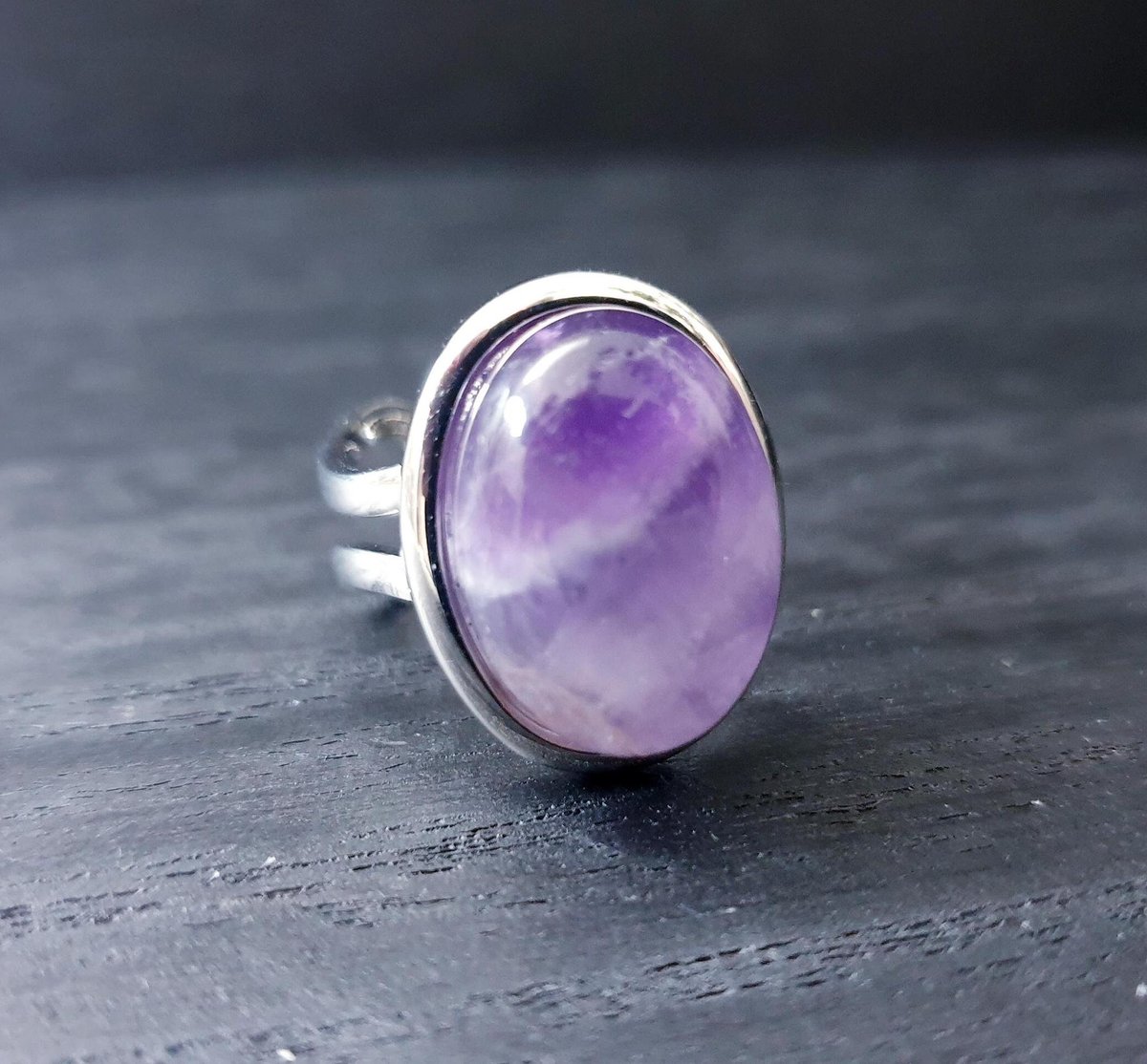 - Natural amethyst cabochon (18x13mm) - Silver plated adjustable band - Scottish handmade jewelry by Saorsa Jewelry - Includes gift packaging and stone information