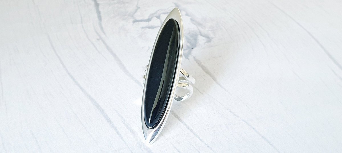 This black onyx statement ring features a dramatic 9x40mm oval cabochon that commands attention with its deep, glossy finish. The smooth silver-plated adjustable band creates a sleek foundation that perfectly complements the rich, opaque gemstone.