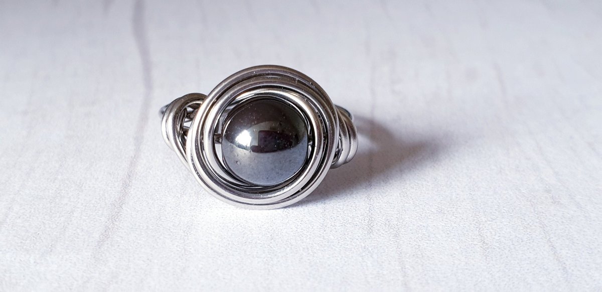 A delicate **wire wrapped hematite ring** featuring an 8mm natural gemstone in hypoallergenic stainless steel - perfect for stacking or wearing solo.
