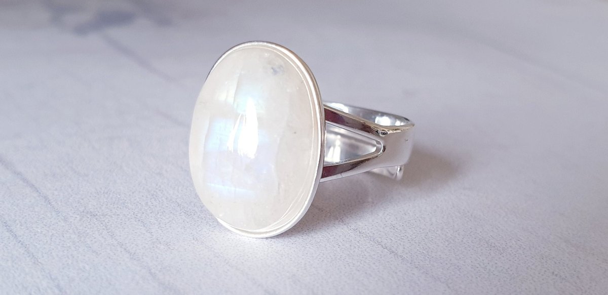 Captivating **rainbow moonstone ring** in sterling silver featuring an 18x13mm natural cabochon with stunning iridescent flashes on an adjustable band.